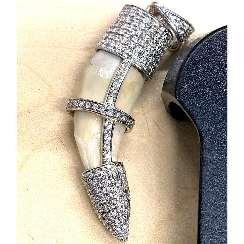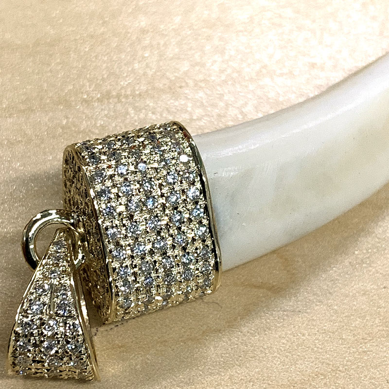 Strength meets elegance in this 14K white gold diamond tusk pendant from Ayala’s Jewelry in Huntington Park. The pendant showcases a natural tusk gracefully framed and capped in brilliant white gold, fully accented with meticulously set diamonds for an unmatched sparkle. Each facet reflects not just light, but the artistry and dedication that define our craftsmanship.