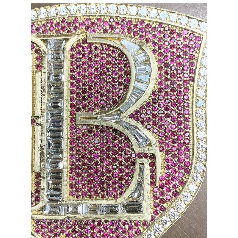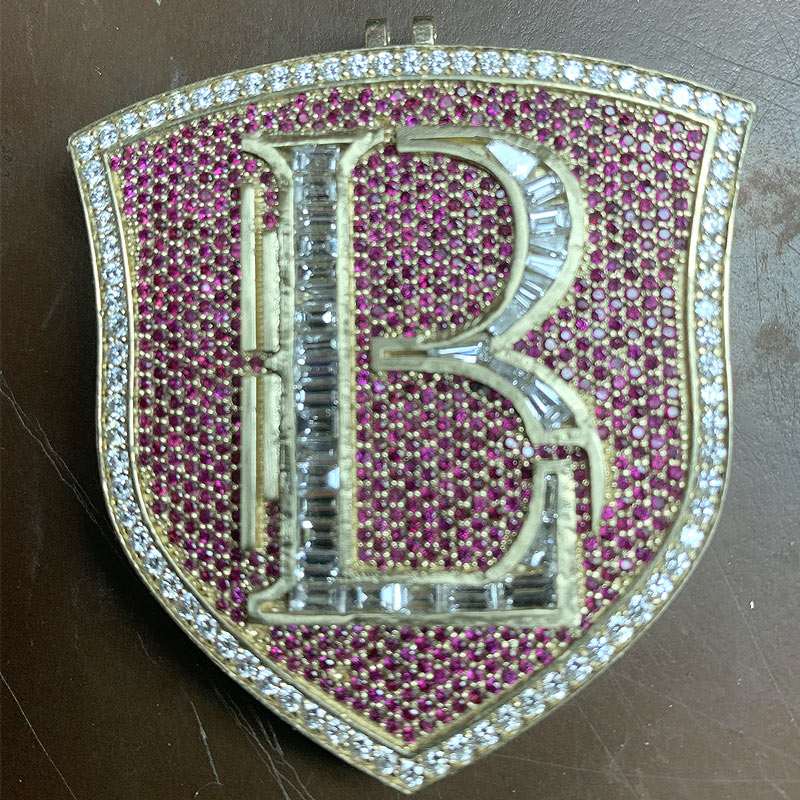 Your initial should be worn with pride, and this custom 14K gold “B” pendant was made to make an unforgettable impression. Designed in a striking shield shape, it is richly adorned with vibrant red sapphires and brilliant diamonds, each stone hand-set to create a radiant play of light and color. The textured gold background adds depth, while the polished “B” stands boldly at the center, embodying both personal significance and style.