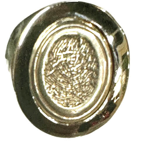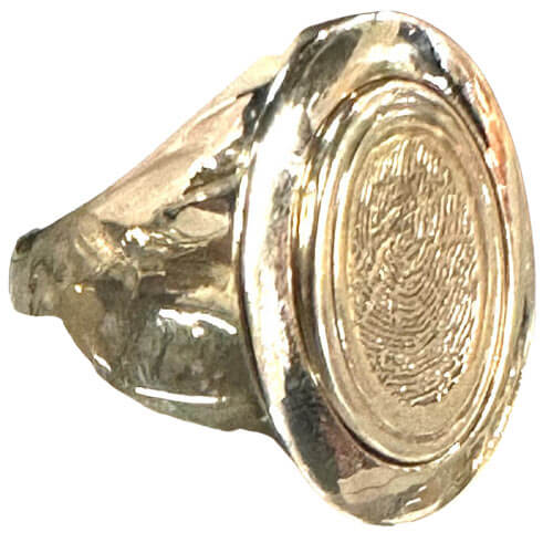 This exquisite 14K yellow gold thumbprint ring is a true celebration of personal connection and timeless beauty. Expertly handcrafted, it preserves the distinct fingerprint of its owner, turning an intimate detail into an elegant work of art.